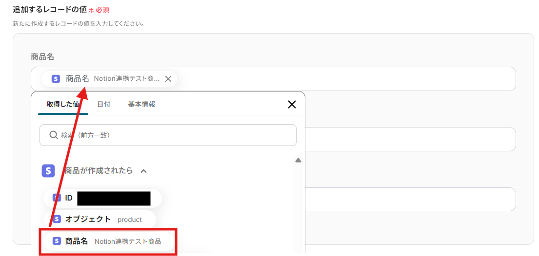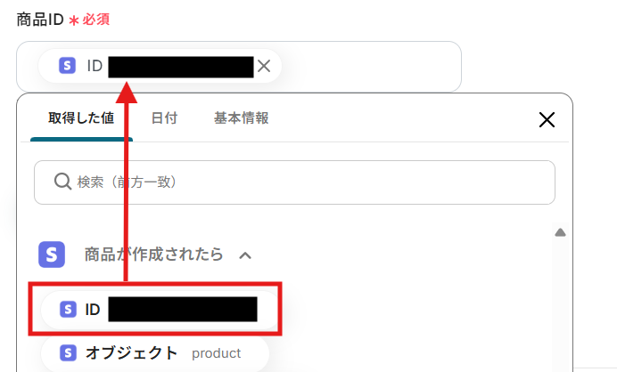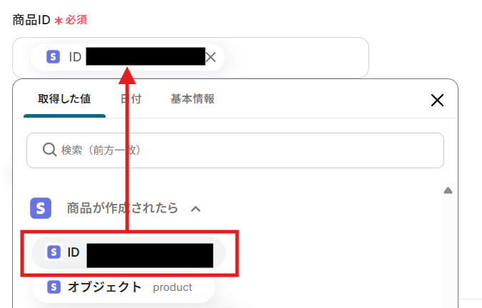 編集欄をクリックして、「商品が作成されたら」から「ID」を選択します。