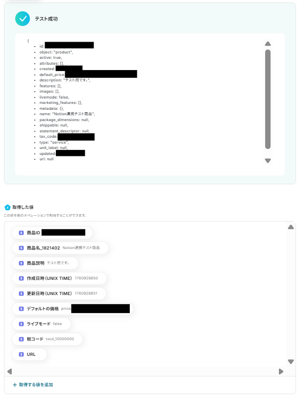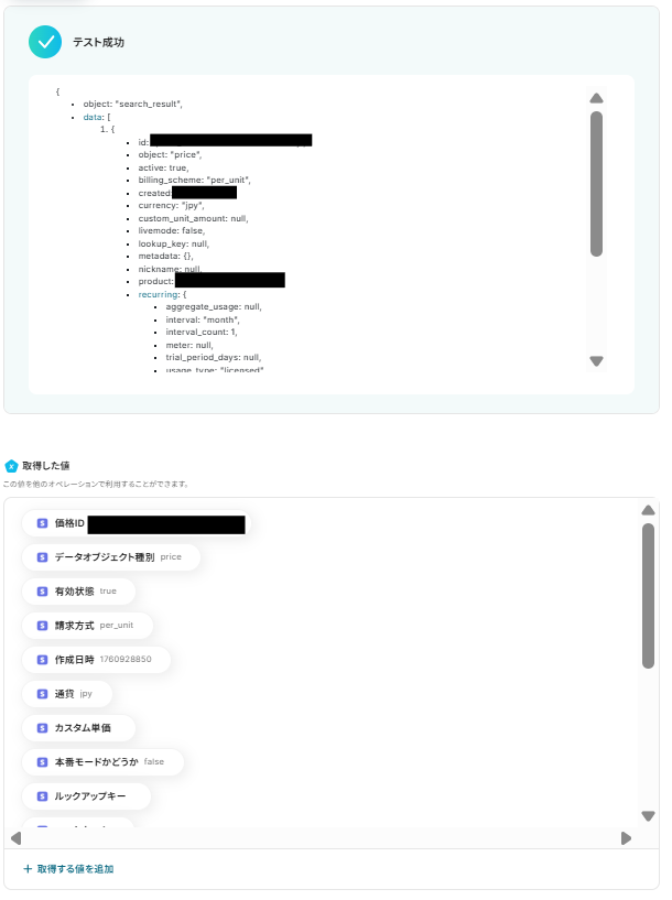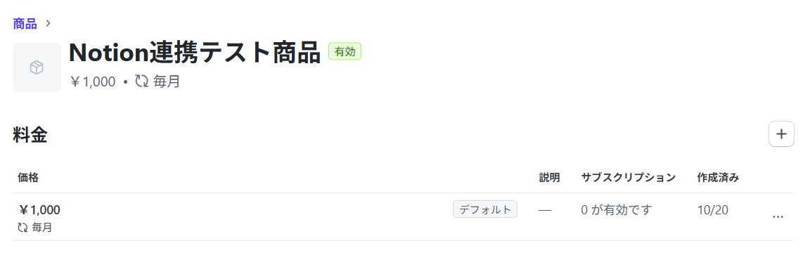 テストが成功すると、取得した値の各項目の横にStripeで作成した商品の情報が表示されます。