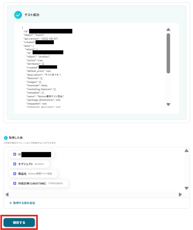 最後に、Stripeで新しく作成した商品情報をNotionのデータベースに自動で記録する設定を行います。