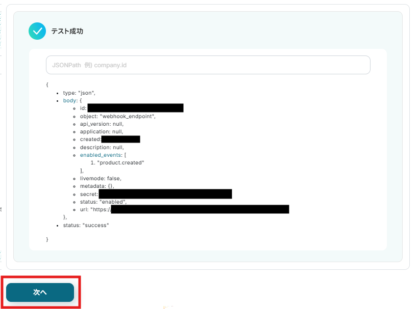 まず、Webhookの設定を行うために、「テスト」をクリックしてください。