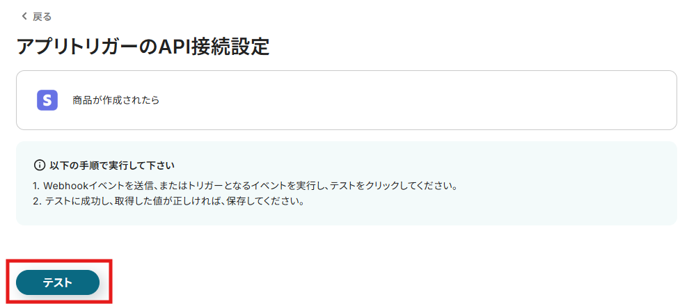 ※このフローボットはWebhookイベントが確認された時に起動する仕組みですので、新しい商品の作成が必要です。