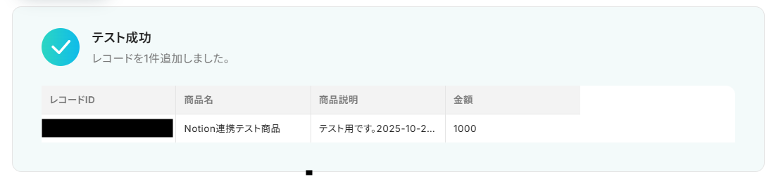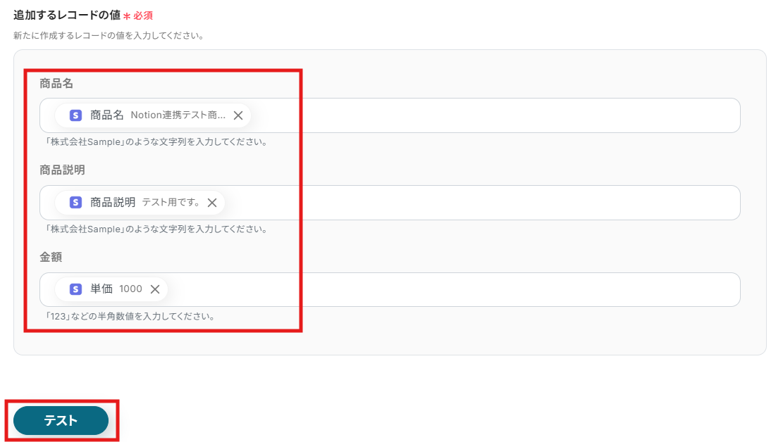 追加するレコードの値の選択が完了したら、「テスト」をクリックします。