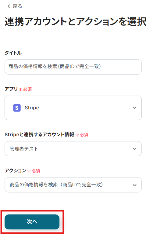 こちらも、ステップ1でマイアプリ連携したStripeのアカウント情報が自動で表示されます。