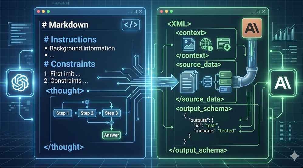 例えば、<context>(背景情報)、<source_data>(参照すべき資料)、<output_schema>(出力形式の定義)のようにタグを使い分けることで、指示(Instruction)と情報(Data)の混同を防げます。