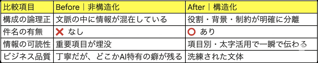 Beforeの非構造化プロンプトでは、文章自体は丁寧ですが、ビジネスメールに不可欠な「件名」が欠落し、重要な復旧時刻も本文に埋もれてしまっています。これでは受信側が内容を瞬時に把握できず、二度手間が発生します。