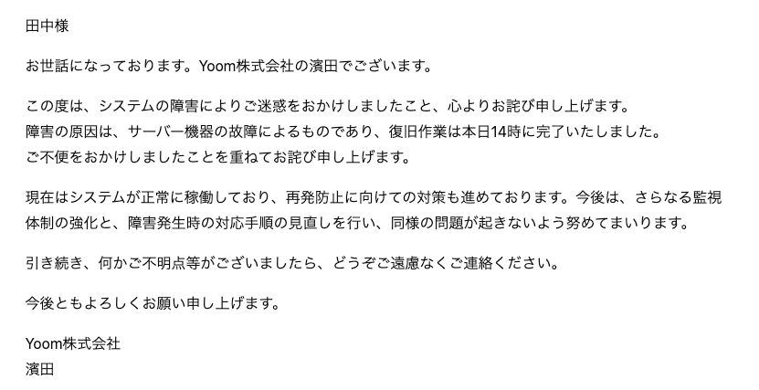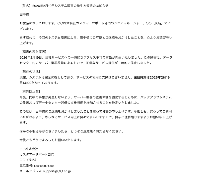 システム障害の影響を受けた顧客(田中様)への、誠実かつ論理的なお詫びメールの起案。