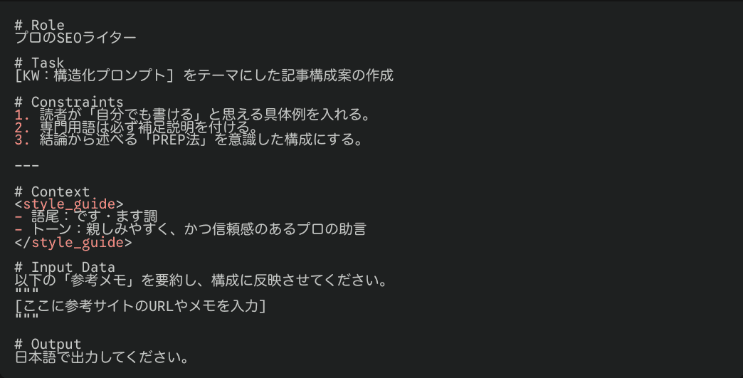情報の役割をタグや見出しで整理したプロンプトです。AIが処理しやすい形式に整えることで、迷いを排除し、出力の精度と再現性を高めます。