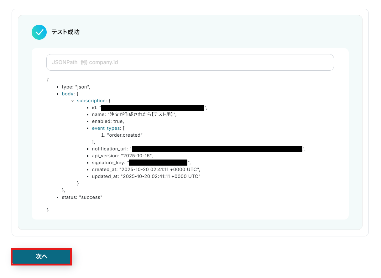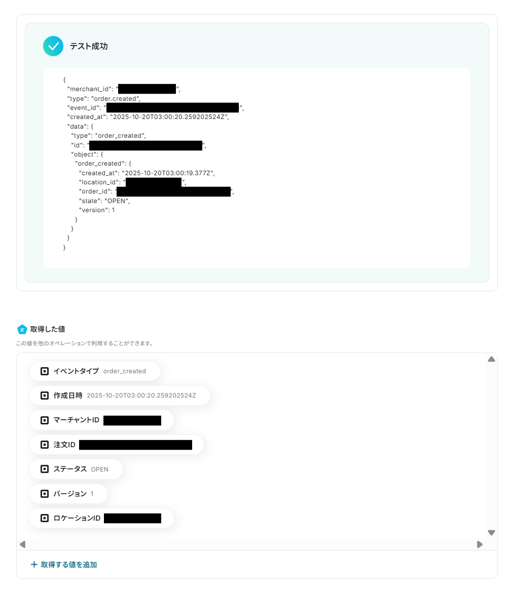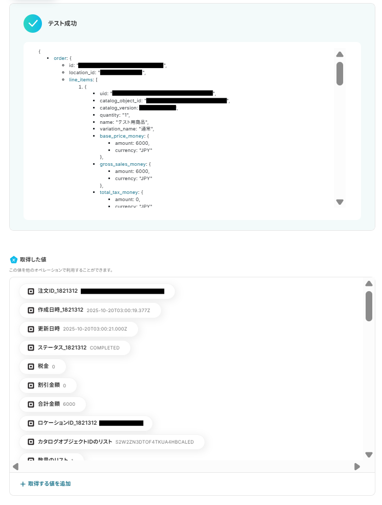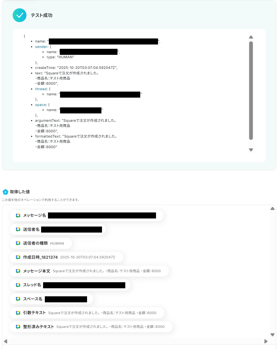 テストが成功すると、「テスト成功」という画面が表示され、Squareから取得した値が反映されているはずです。