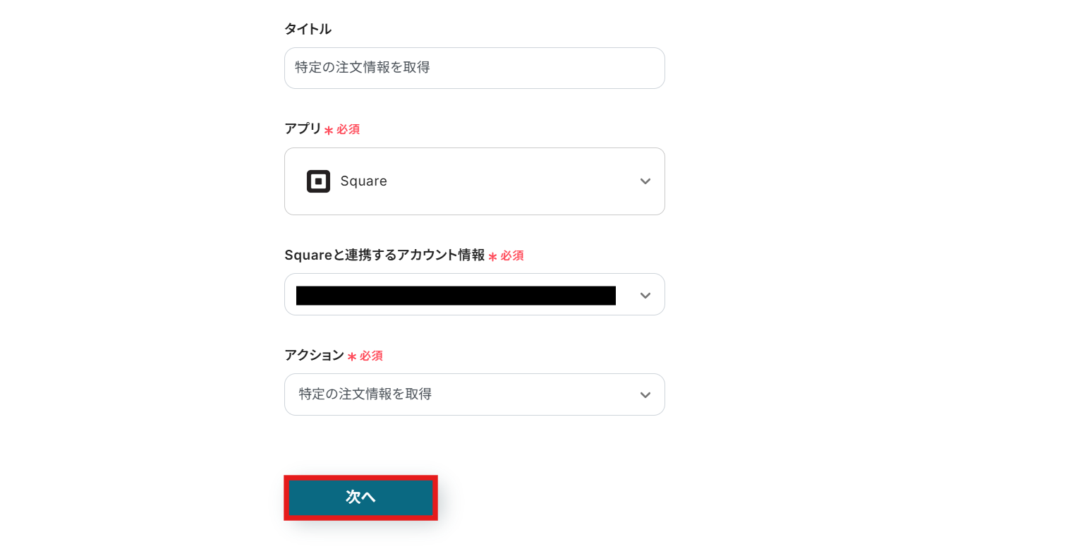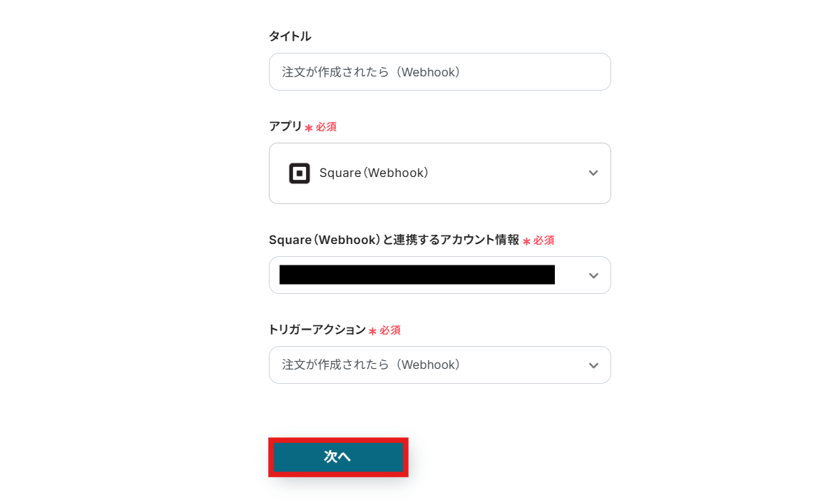 Square(Webhook)と連携するアカウント情報はプルダウンから選択します。