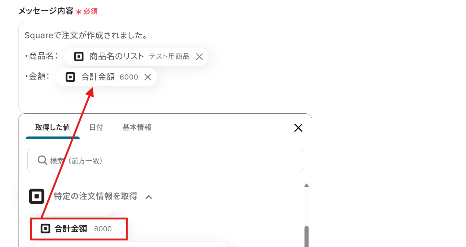 メッセージ内容:編集欄をクリックすると、Squareから取得した値を引用できるので、メッセージ作成の際には活用してくださいね!