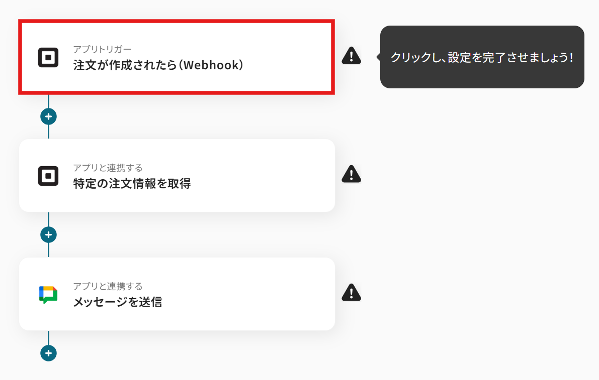 まず、一番上の「注文が作成されたら(Webhook)」のアイコンをクリックします。