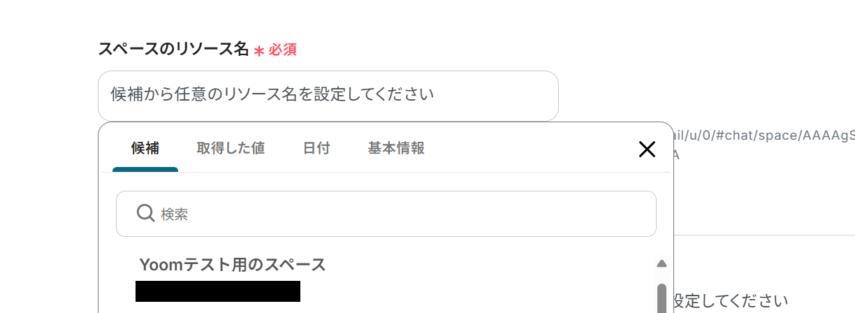 スペースのリソース名:入力欄をクリックすると候補が表示されるので、その中から選択しましょう。