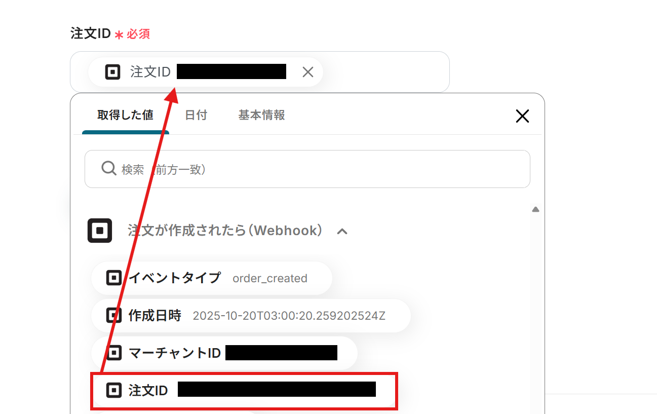 先ほど作成した注文についての情報を取得したいので、入力欄をクリックし、注文が作成されたら(Webhook)から「注文ID」を引用します。