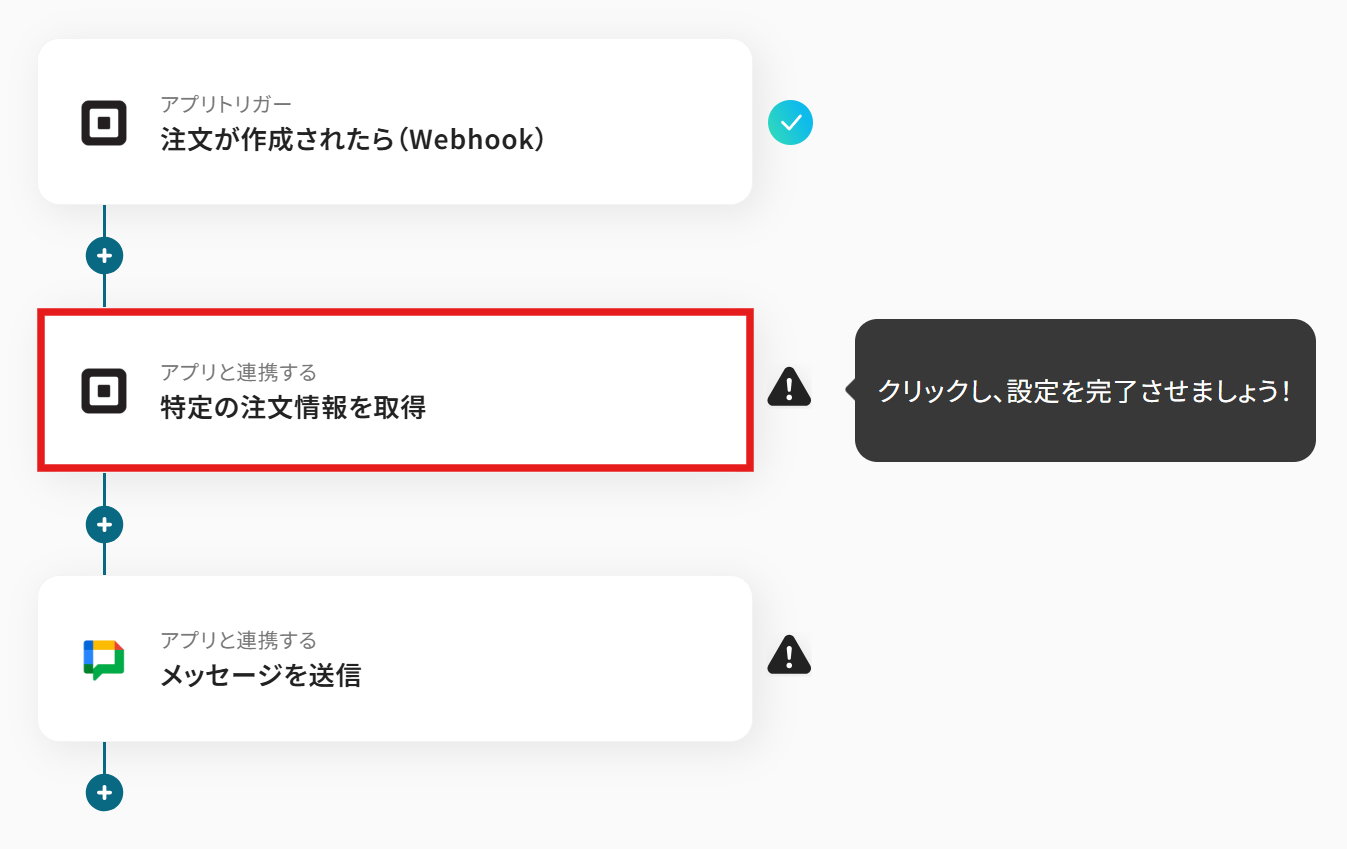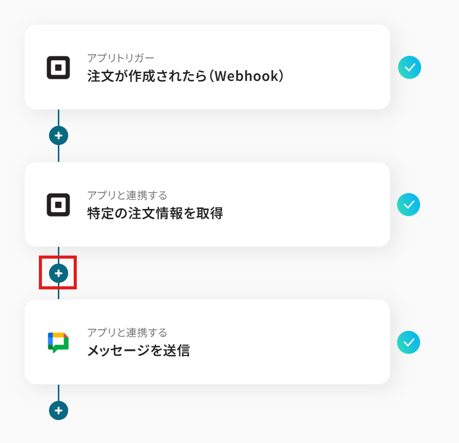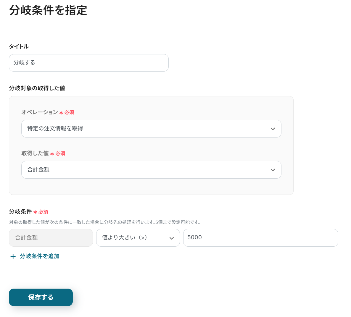 今回の場合、「特定の注文情報を取得」の下の+マークをクリックし、分岐を設定することで、条件の設定が可能です。