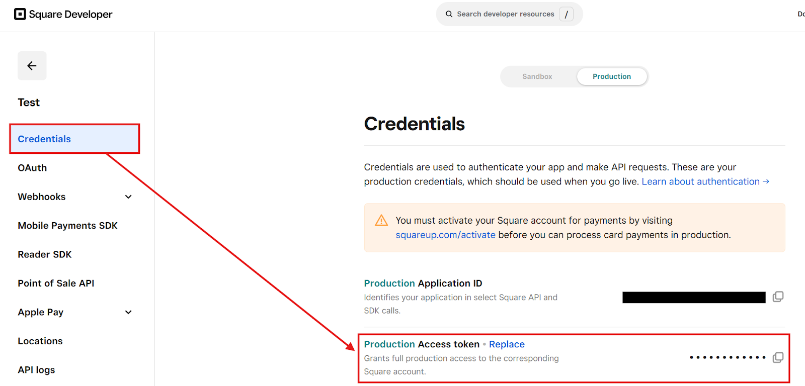2.アクセストークンはSquareの開発者向けアプリページからログインしてアプリケーションを作成すると、「Access token(Production)」を確認できます。