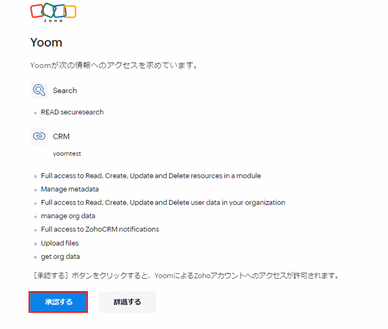 Zohoドメイン:ご利用のZohoのドメインを「.com」「.com.au」「.eu」「.in」「.com.cn」「.jp」の中からいずれかを設定。