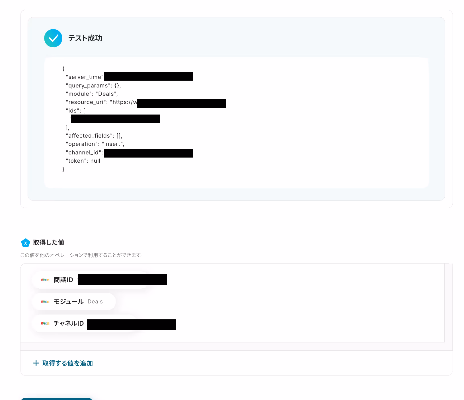 テストに成功すると、「取得した値」に作成された商談のID情報などが追加されます。