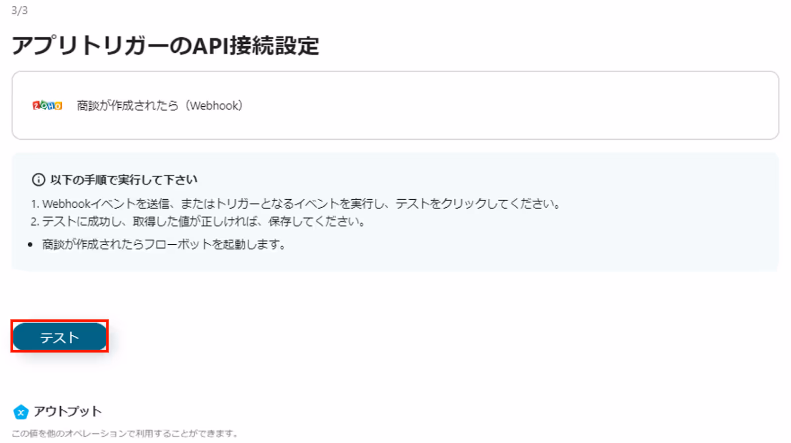商談を作成後にYoomの設定画面に戻り、テストをクリック
