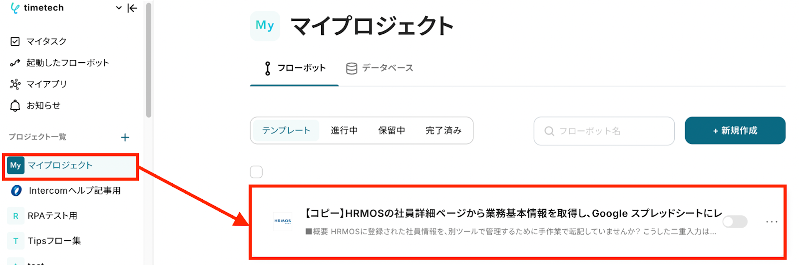 左側にあるメニューの「マイプロジェクト」から、コピーしたテンプレートを開きます。
