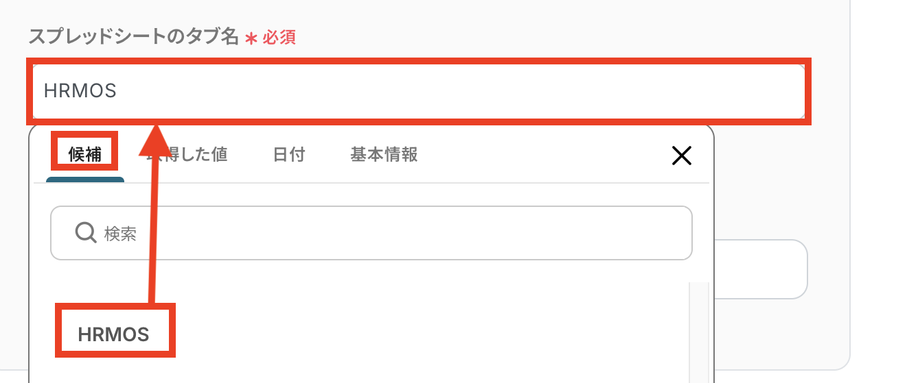 「スプレッドシートのタブ名」も同様に候補から選択します。