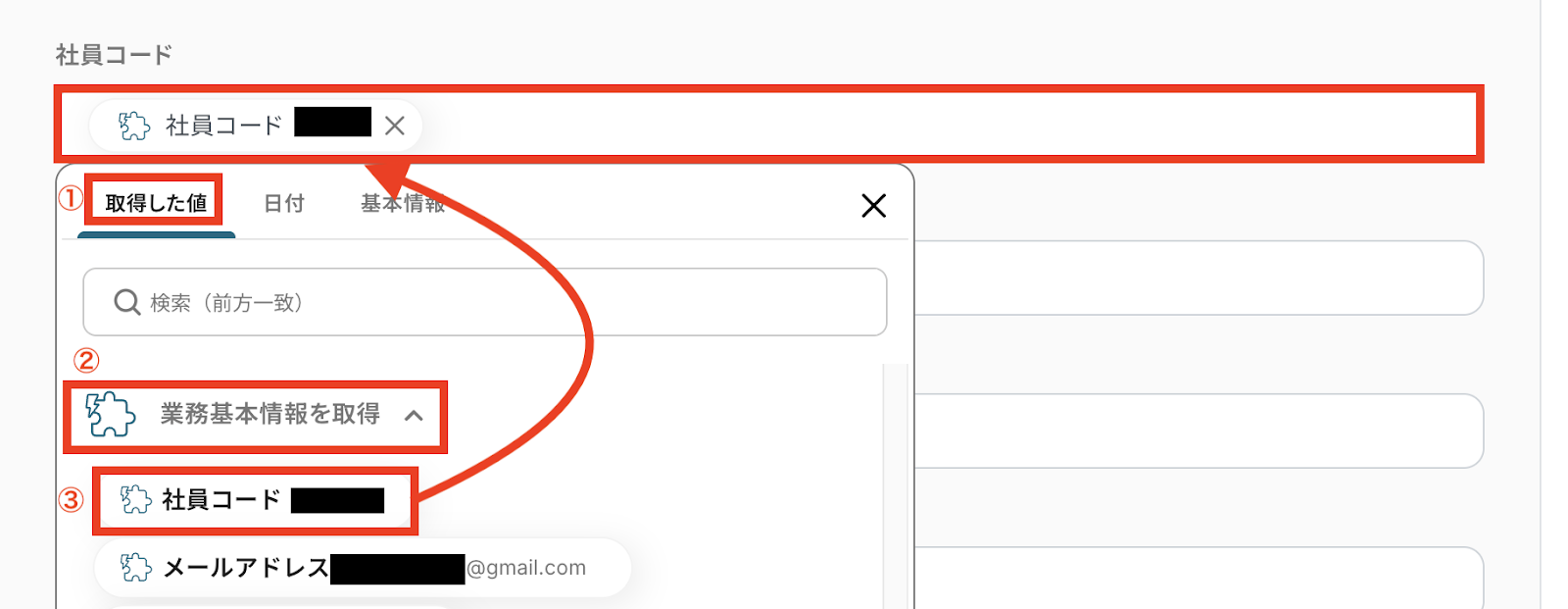③「社員コード」などの取得した値を選択