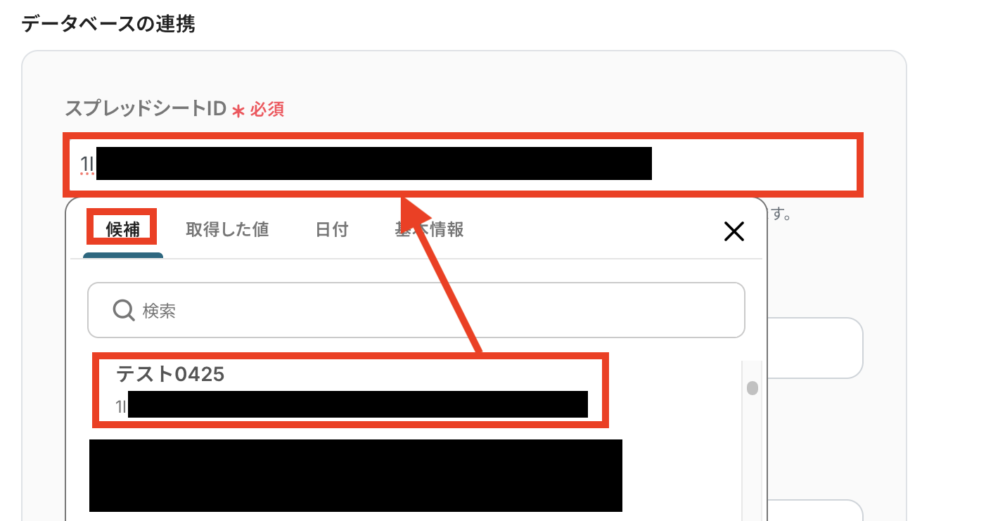 「スプレッドシートID」は候補から選択可能です。