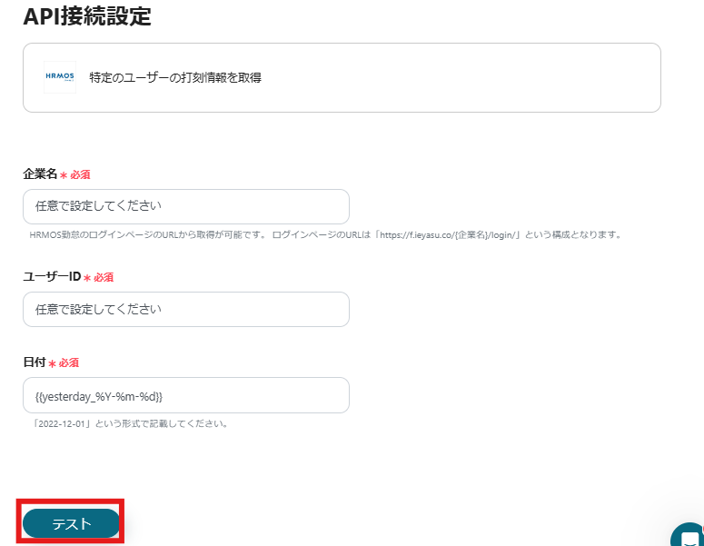 入力が完了したら「テスト」をクリックし、