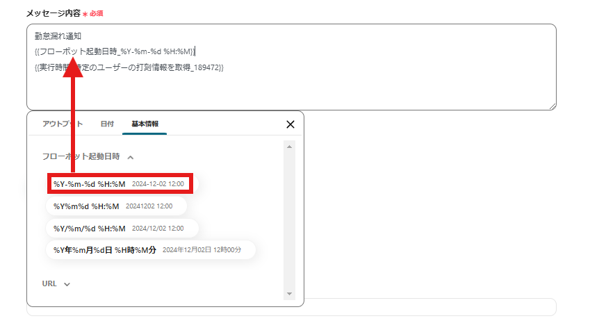 以下の画面では参考として、「フローボットが起動した日時」と「打刻情報の取得内容」が通知されるような内容にしています。