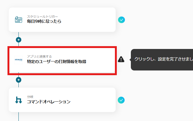 ・フローの起点となるHRMOS勤怠のトリガー設定と、その後に続くChatworkのオペレーション設定