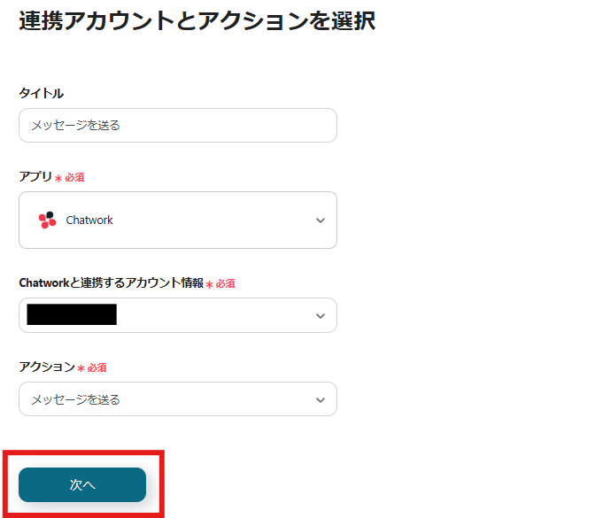 今回連携するChatworkのアカウントに間違いがないかを確認し、「次へ」をクリックしましょう。