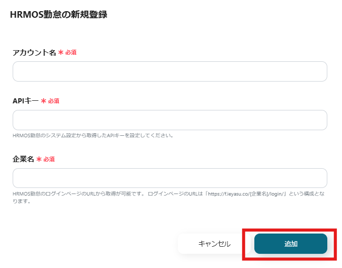 その後、HRMOS勤怠にアクセスし、アクセストークンを取得して以下のようにアカウント名とアクセストークンを設定し追加します。