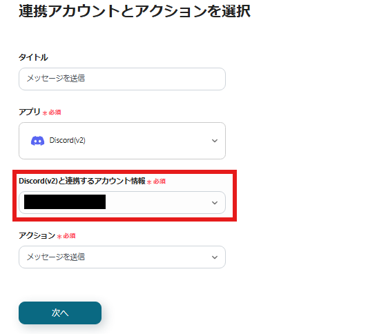 赤枠内が今回連携するアカウントで間違いないか確認し、「次へ」ボタンをクリックします。