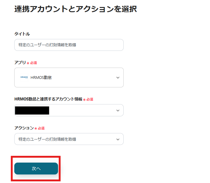 以下の画僧のような画面が表示されるので、今回連携するHRMOS勤怠のアカウントであることを確認し、「次へ」をクリックしましょう。