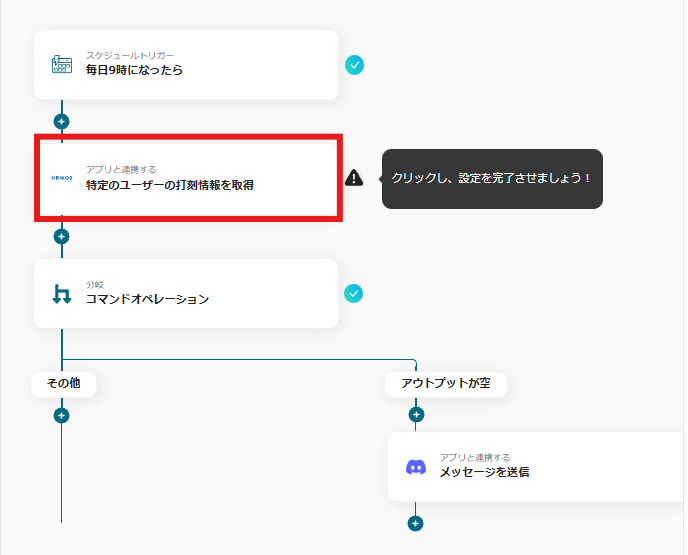 ・フローの起点となるHRMOS勤怠のトリガー設定と、その後に続くDiscordのオペレーション設定