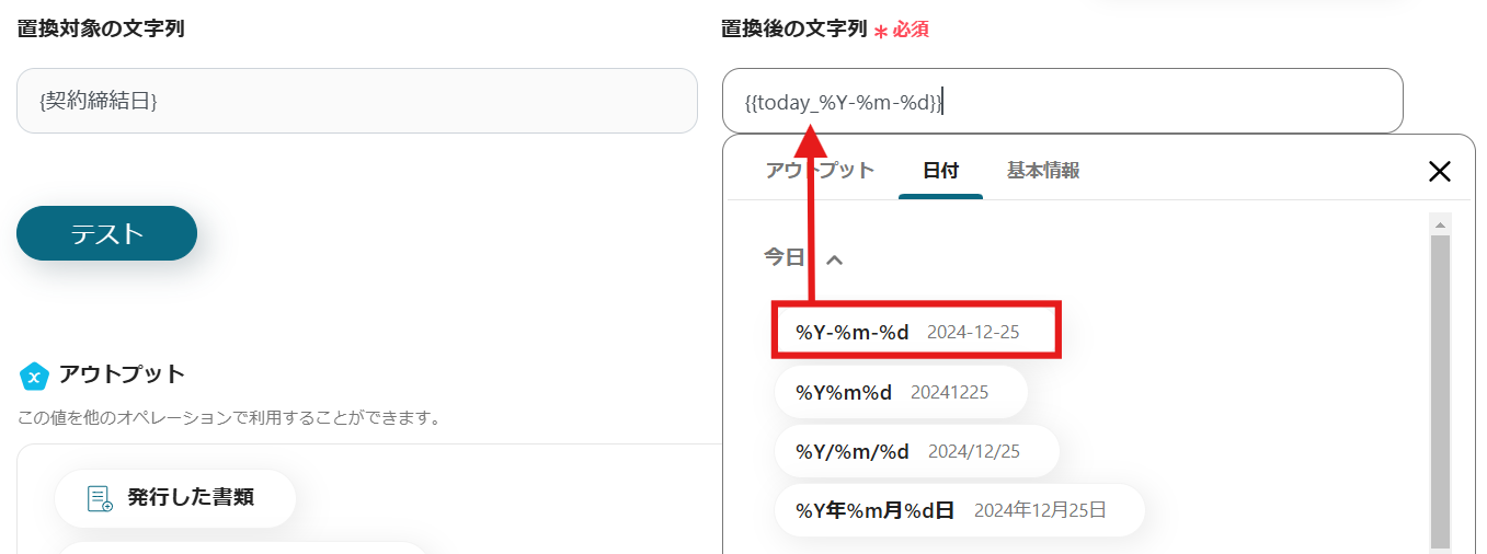 「置換後の文字列」を「日付」→「今日」→「%Y-%m-%d」の順でクリックしましょう。