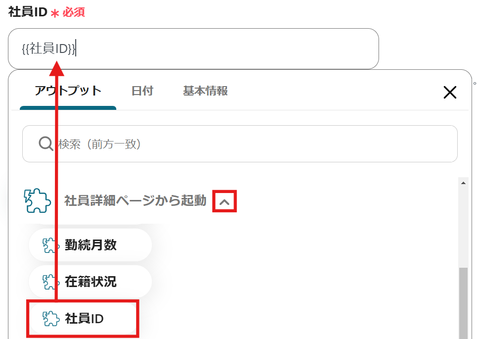 「社員詳細ページから起動」のアウトプットから「社員ID」を選択してください。