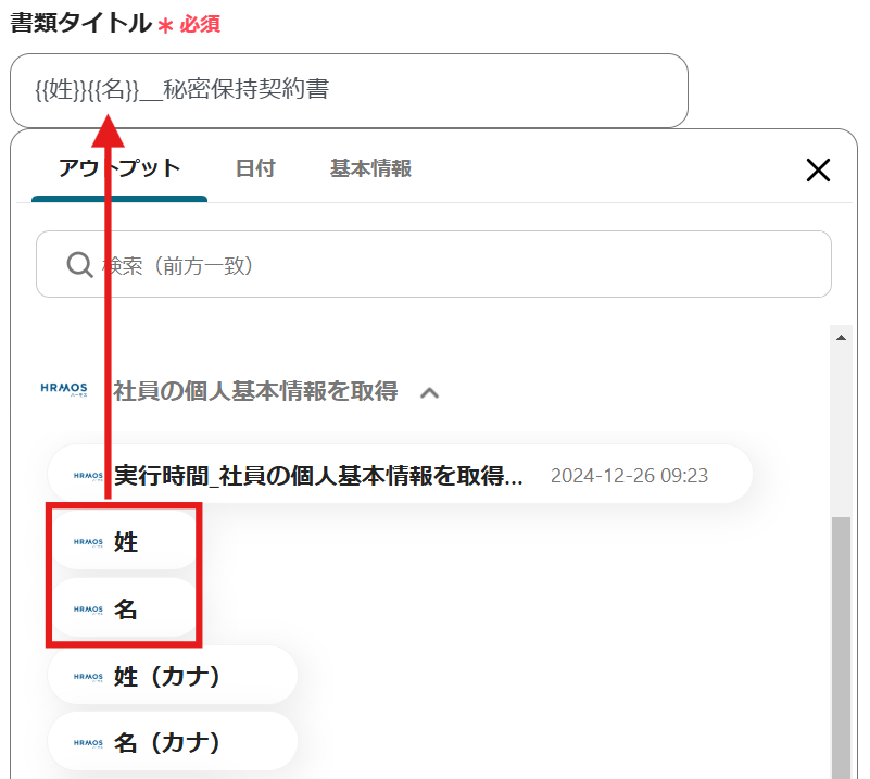 「社員の個人基本情報を取得」のアウトプットを活用すれば、自動的に書類タイトルを作成できます。