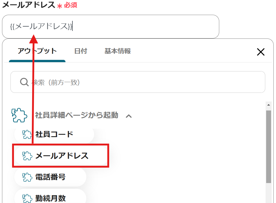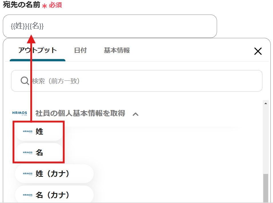 「社員の個人基本情報を取得」のアウトプットから以下のように設定します。