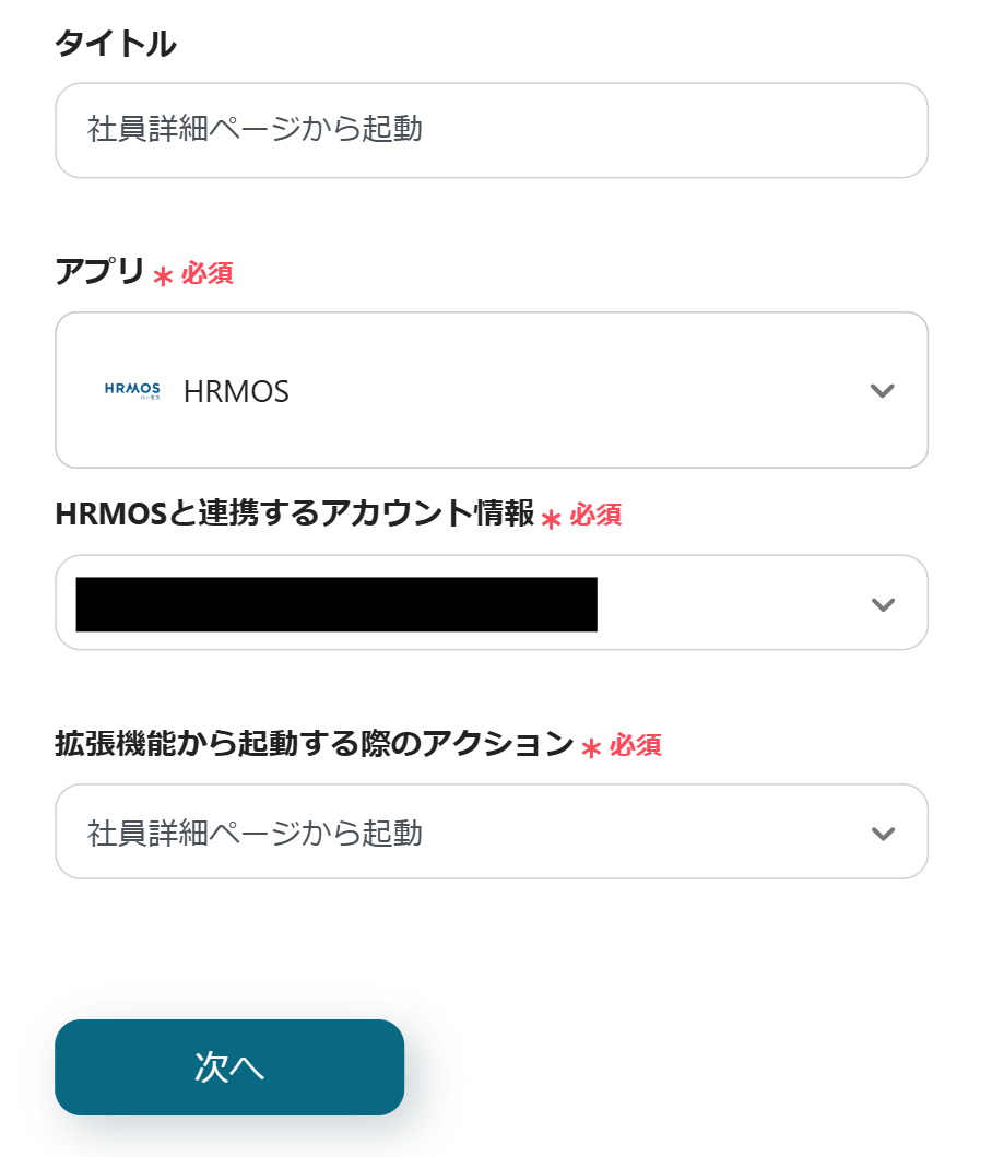 最初に、HRMOSのWebページを開いた状態で拡張機能からYoomのフローボットを起動する設定を行うので、「社員詳細ページから起動」をクリックしましょう。