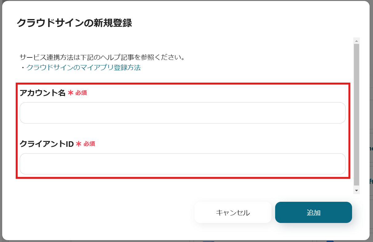 以下の画面が表示されたら、「アカウント名」と「クライアントID」を設定してください。