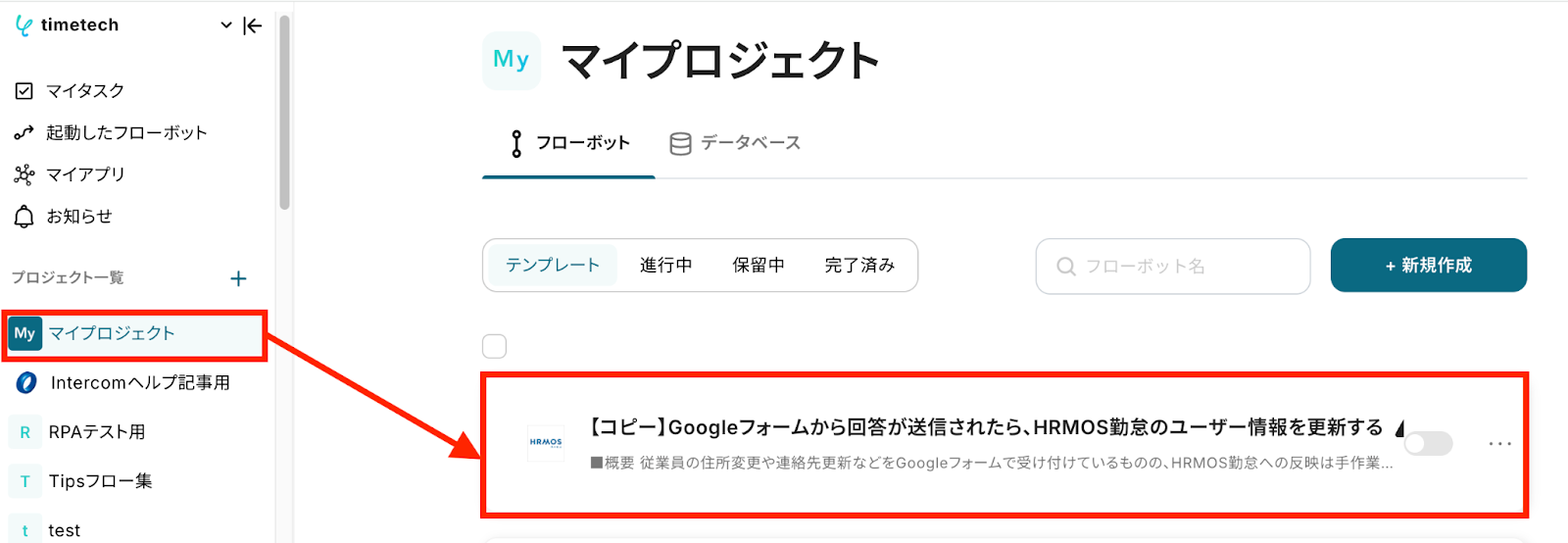 左側にあるメニューの「マイプロジェクト」から、コピーしたテンプレートを開きます。