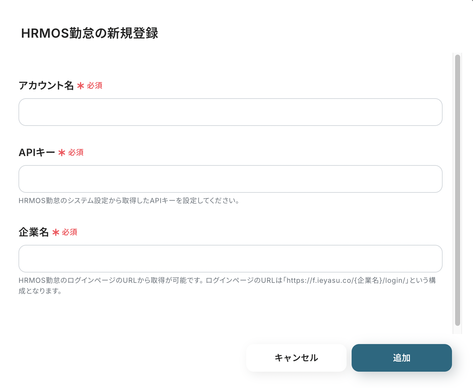 HRMOS勤怠を検索すると新規登録画面が表示されるので、それぞれの項目を入力します。