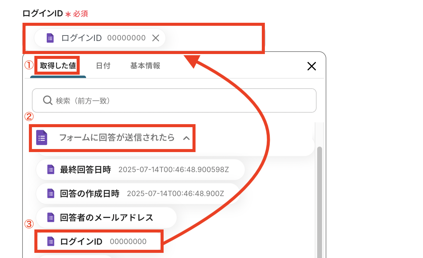 「ログインID」はステップ3で取得した値(Googleフォームの回答内容)を活用して入力します。