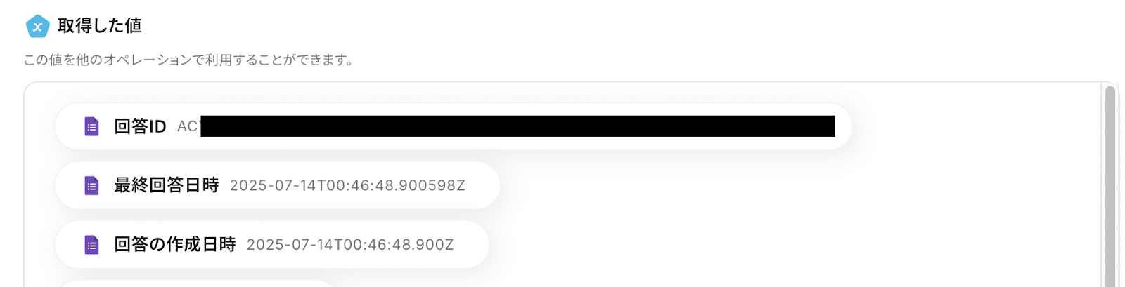 ・Googleフォームをトリガーとして使用した際の回答内容を取得する方法は下記を参照ください。