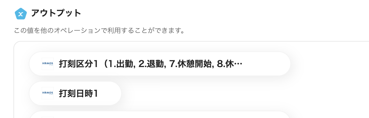 アウトプット情報は、「この値を他のオペレーションで利用することができます。」という注釈の通り、この後のステップで引用・活用できます。
