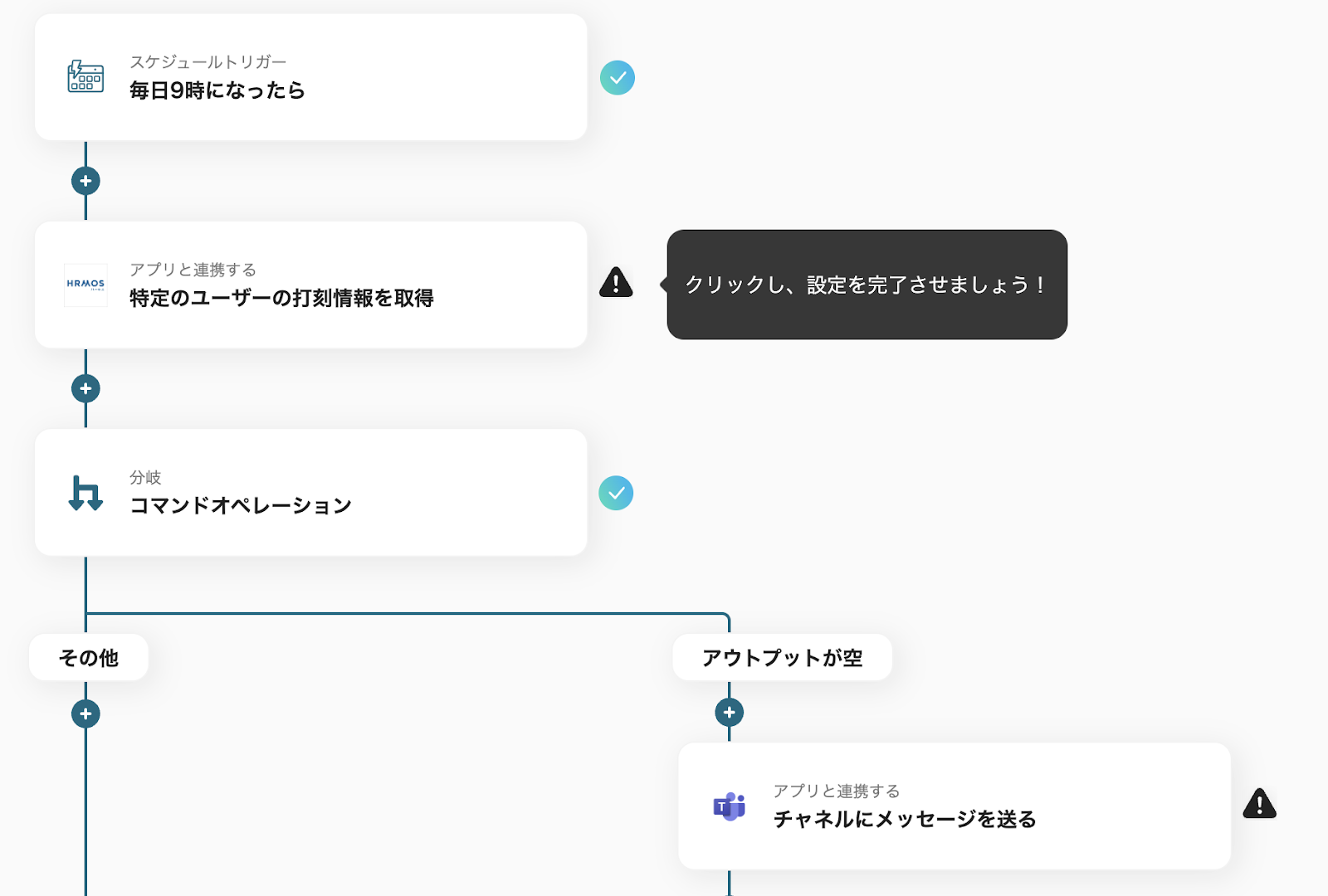 この自動化フローの活用で、Microsoft Teamsの通知でHRMOS勤怠上の打刻漏れ発生が各スタッフに伝えられることで、スタッフ自身が素早く勤怠データを修正する環境を構築することが可能となるでしょう。