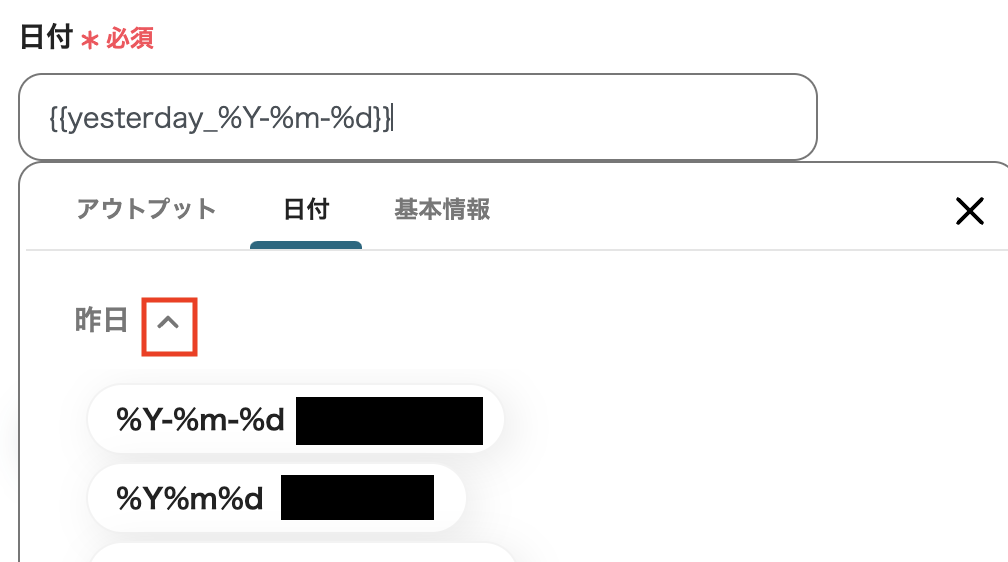 (4)「日付」などの日時情報を設定する項目では、入力バーをクリックすると、以下の画面のように【日付】から情報を引用・設定できます。