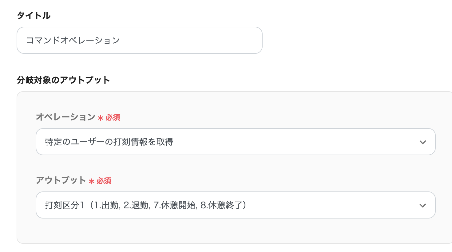 (2)以下の画面のように、このテンプレートでは、分岐対象のアウトプットとして「オペレーション:特定のユーザーの打刻情報を取得」→「アウトプット」を「打刻区分1(1.出勤, 2.退勤, 7.休憩開始, 8.休憩終了)」を対象として指定しています。