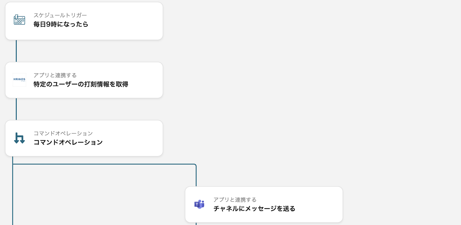 この自動化フローを活用し、Microsoft TeamsにHRMOS勤怠上での打刻漏れの旨を通知することで従業員自身が前日の打刻漏れを修正し、未修正データを提出してしまう、などの混乱を予防することができるでしょう。