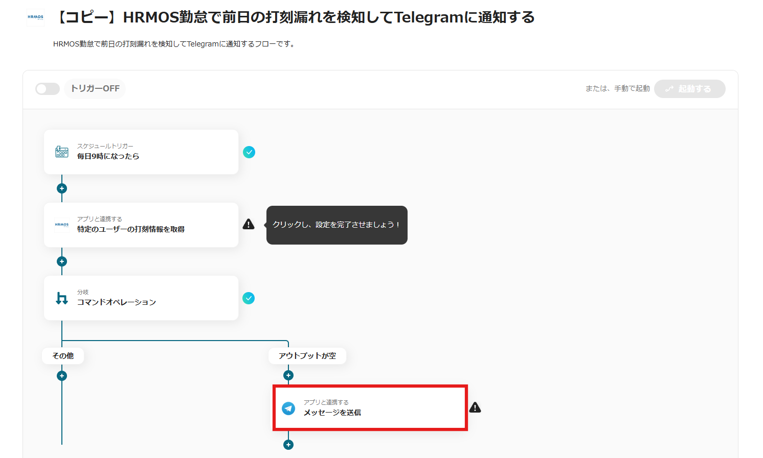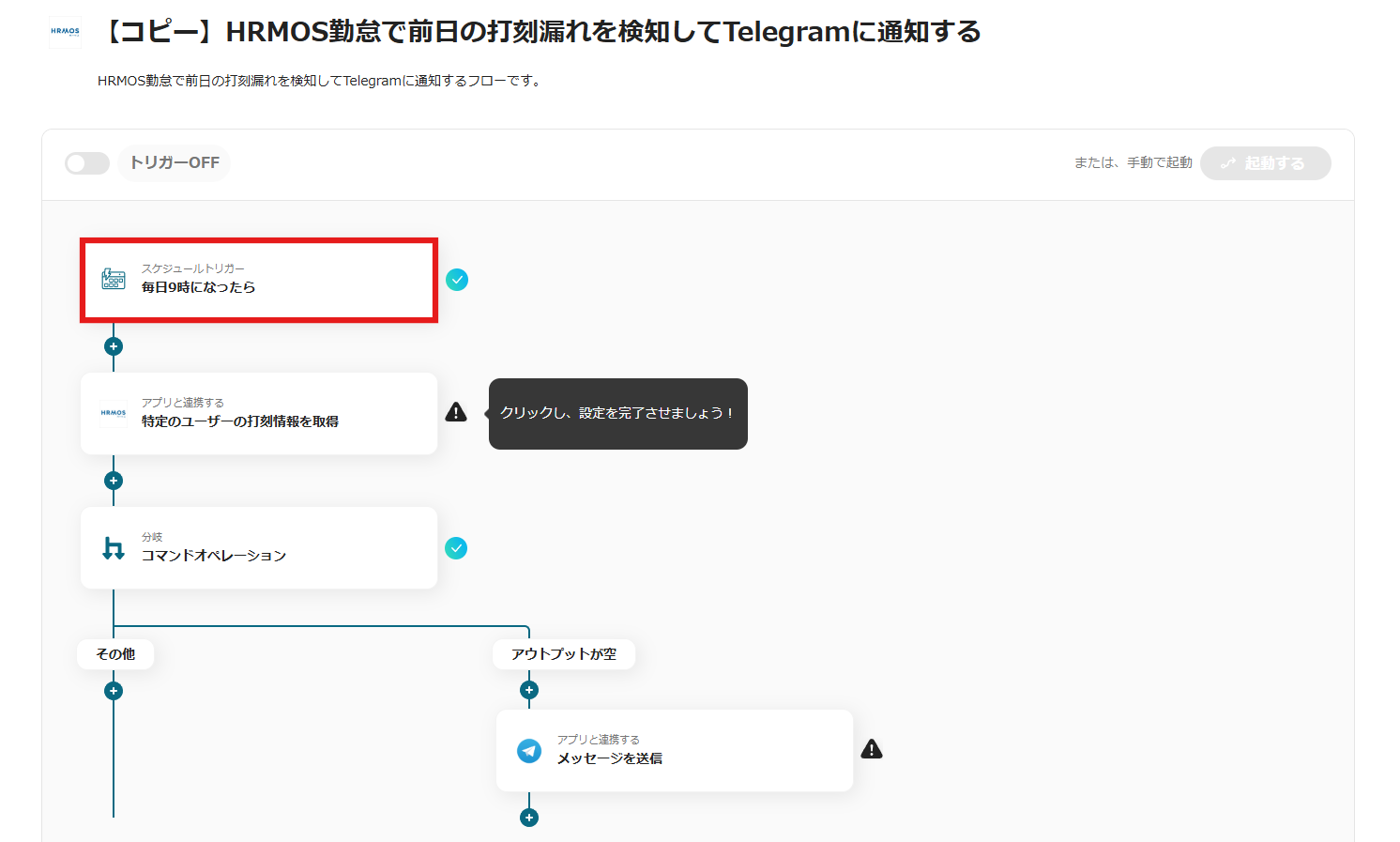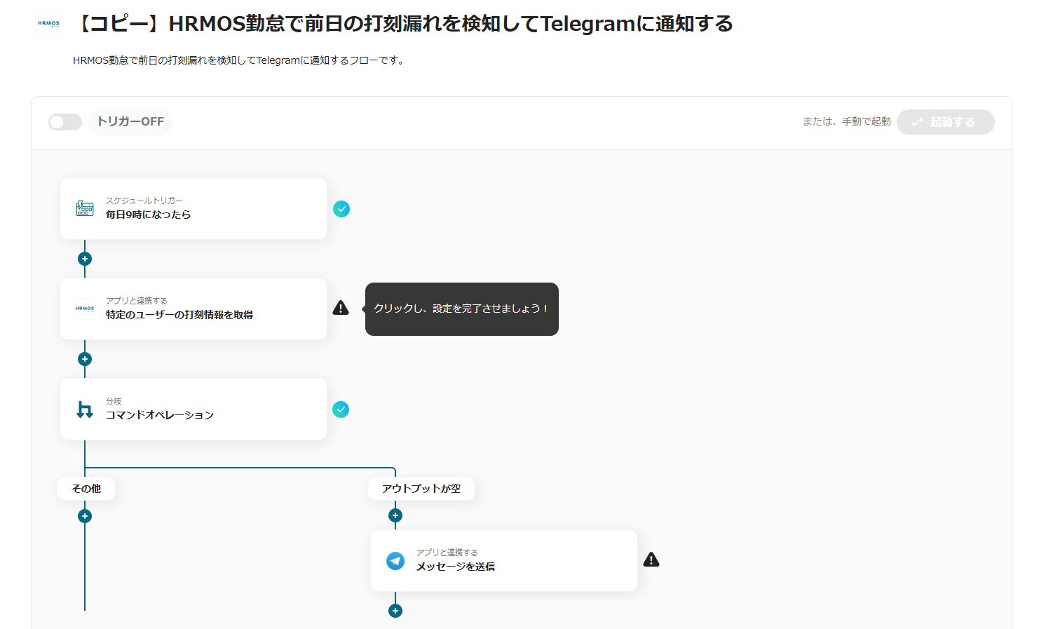 今回は「HRMOS勤怠で前日の打刻漏れを検知してTelegramに通知する」という自動化を、下記のテンプレートを用いて行います。